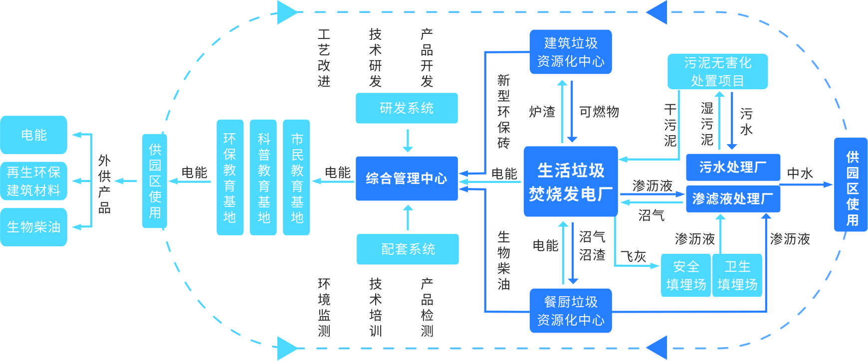 3003.com官网环境循环经济产业园模式以生活垃圾焚烧发电厂为园区核心,统筹各类生活垃圾处置中心的配套建设,对各类生活废弃物进行无害化、减量化、资源化处理,输出电能、建筑材料、生物柴油等副产物,为园区生产、生活提供服务。