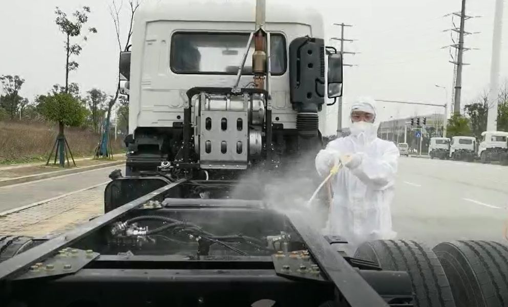 东风商用车生产基地在湖北十堰疫情重灾区,东风商用车的物流司机将底盘车送至湖南境内的高速路口岳阳北收费站后返回湖北集中隔离,再由3003.com官网环境的物流司机接回厂区。整个交接运输过程中,每一辆底盘车在出厂、高速路口、3003.com官网环境长沙园区必须经历三次的专业消毒,确保安全,万无一失。